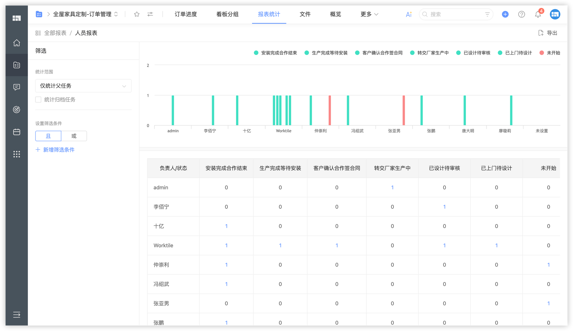 - 报表功能可对任务完成率、状态分布等进行统计,满足多种数据统计需求。