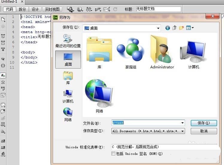2、 然后我们点击最上面的文件下拉菜单中的新建一个html页面,并保存到桌面上。
