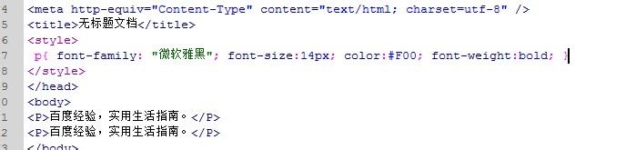 3、 我们在html页面中敲入一个p标签,并输入一些文字,然后给p标签中的文字设定一些样式。
