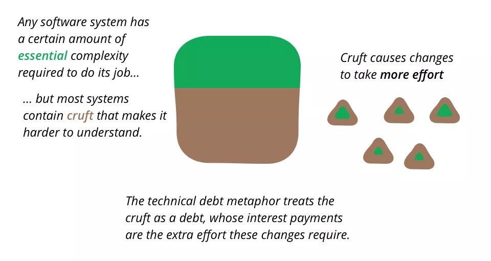 cruft 的一个常见比喻是技术债务,添加功能的额外成本就像支付利息,清理垃圾就像支付本金一样。虽然这是一个有用的比喻,但它确实鼓励许多人相信 cruft 比在实践中更容易测量和控制。