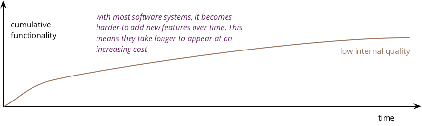 这就是内部质量差的情况。最初进展很快,但随着时间的推移,添加新功能变得越来越困难。即使是很小的改动也需要程序员理解大范围的代码,那些难以理解的代码。当他们进行更改时,会发生意外损坏,导致测试时间过长和需要修复的缺陷。