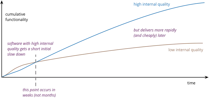 我评估线路交叉点的方法是征求我所知道的熟练开发人员的意见。而答案却出乎很多人的意料。开发人员发现低质量的代码会在几周内显著降低他们的速度。因此,内部质量和成本之间的权衡适用的跑道并不多。即使是小的软件工作也受益于对良好软件实践的关注,这当然可以从我的经验中证明。