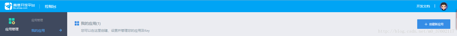 五、点击获取之后会进入到控制台,在右上角有一个创建应用,点击创建应用。按照要求来填写内容