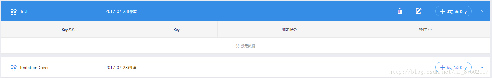 六、可以看到就已经有一个应用已经被创建了,然后点击右上角添加新key