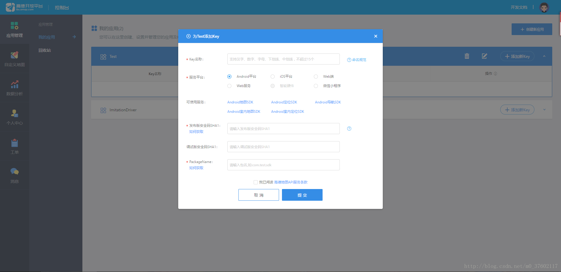 然后把两个SHA1安全码对应填上去,最后填入你的项目包名,最后点击提交。这样就获取到API Key了。