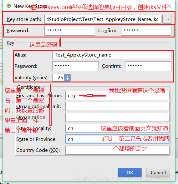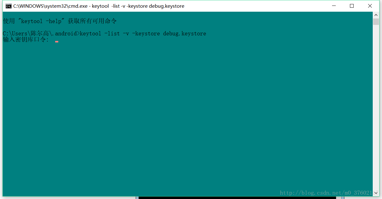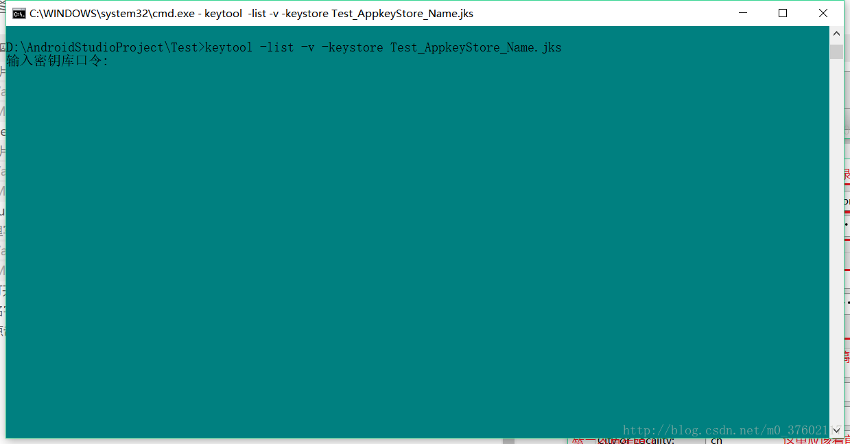 然后打开命令行,先cd 到你的项目目录下面,还是刚刚那段命令keytool -list -v -keystore ,但是后面的文件的名字得改为刚刚生成的Test_AppkeyStore_Name.jks,输入之前你设置的密码,密码同样不可见,输入完点击回车