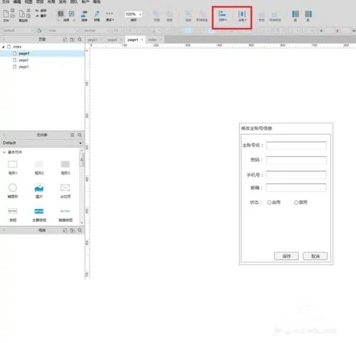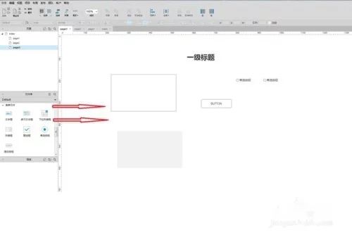 控件的拖动。页面左侧的元件库里面有基本原件,表单原件和表格等,选中需要的元件如页面边框,按钮,单选框等 按住鼠标可以拖到右边的工作区域。
