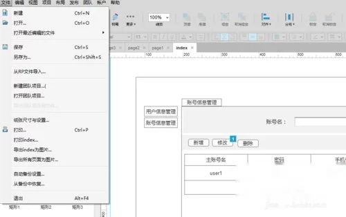 项目的保存和导出。文件菜单下面有保存选项,保存的是rp文件只能在Axure中打开,也可以保存成图片的形式,这样每一个页面就是一个图片。也可以使用发布菜单生成html的形式。