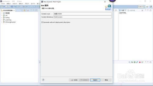 7.单击【下一步】按钮,将弹出配置Web模块设置的对话框,从中勾选“Generate web.xml deployment descriptor(生成web.xml部署描述符)",其他选项采用默认设置,如下图所示。注意:实际上,Content directory文本框中的值采用什么并不影响程序的运行,读者也可以自行设定,如可以将其设置为WebRoot。