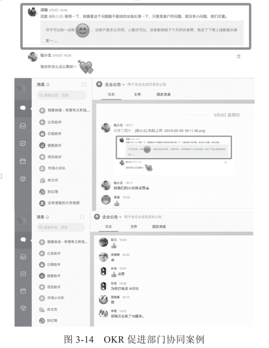 在 OKR 联结和实施的过程中,团队的协同效果非常明显。一方面,大家会非常清楚各个部门不是孤立的,向上一层的父目标是各个部门共同的努力方向,大家只不过 是根据各自的职能从不同的维度去为这一共同目标的实现作出贡献,或者是在同样的一个目标下参与其所关联的某一个项目或任务, 各司其职,承担不同的工作,但非常清楚彼此之间工作的关联,也知道大家分工协作是为了实现一个共同的目标。