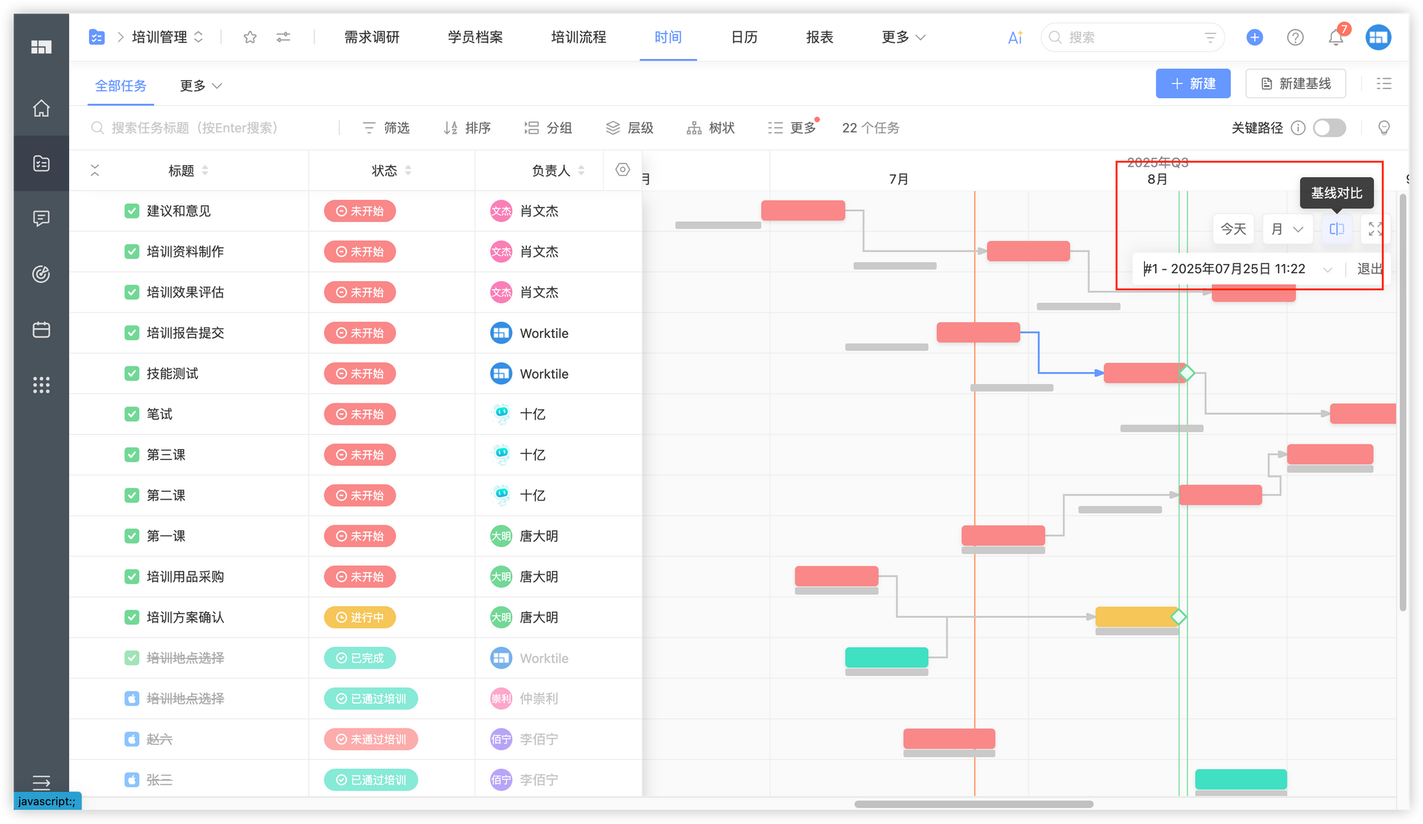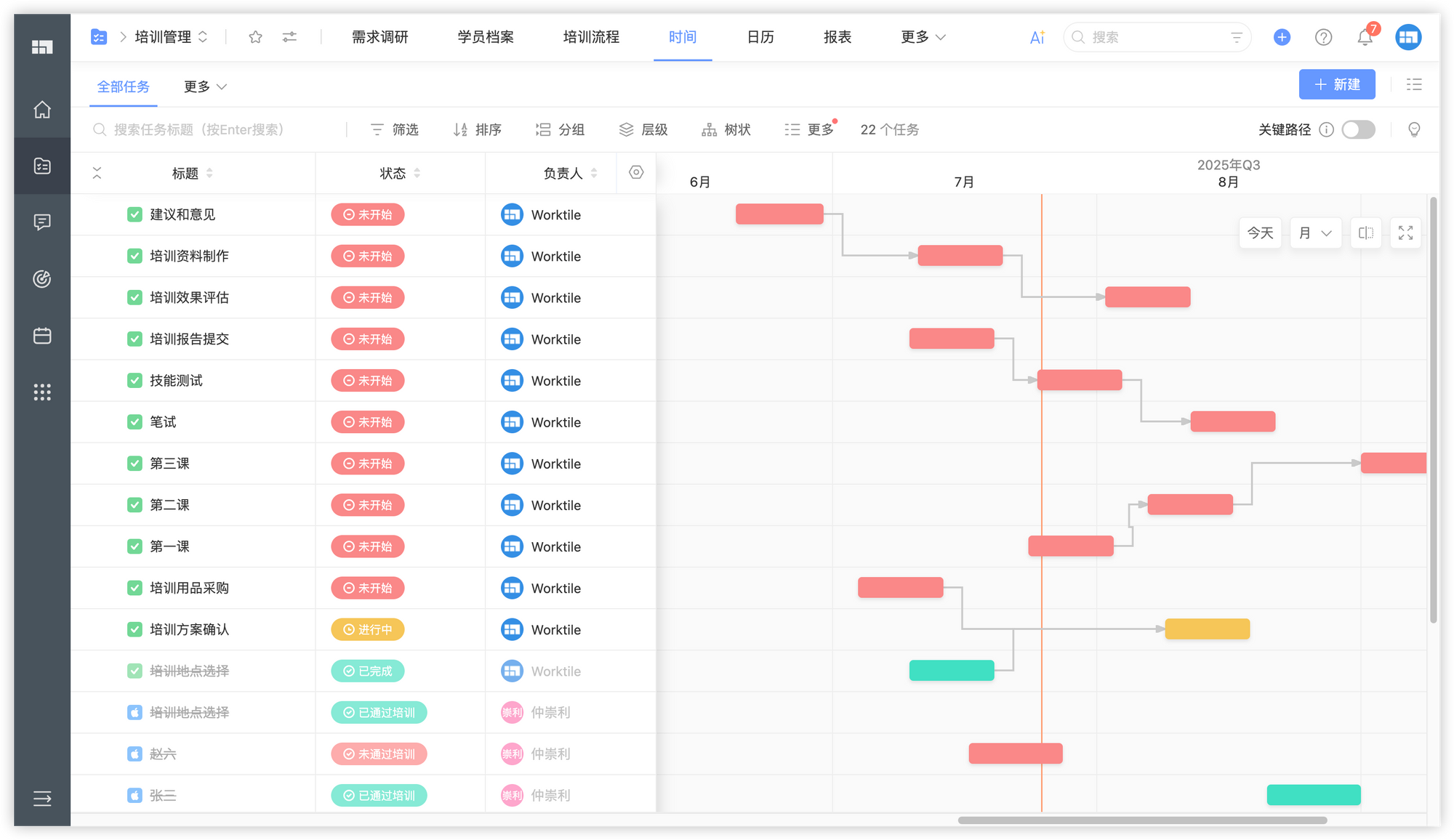 甘特图:通过甘特图清晰展示培训项目的整体排期、任务依赖关系与关键节点,帮助企业制定科学的项目计划。