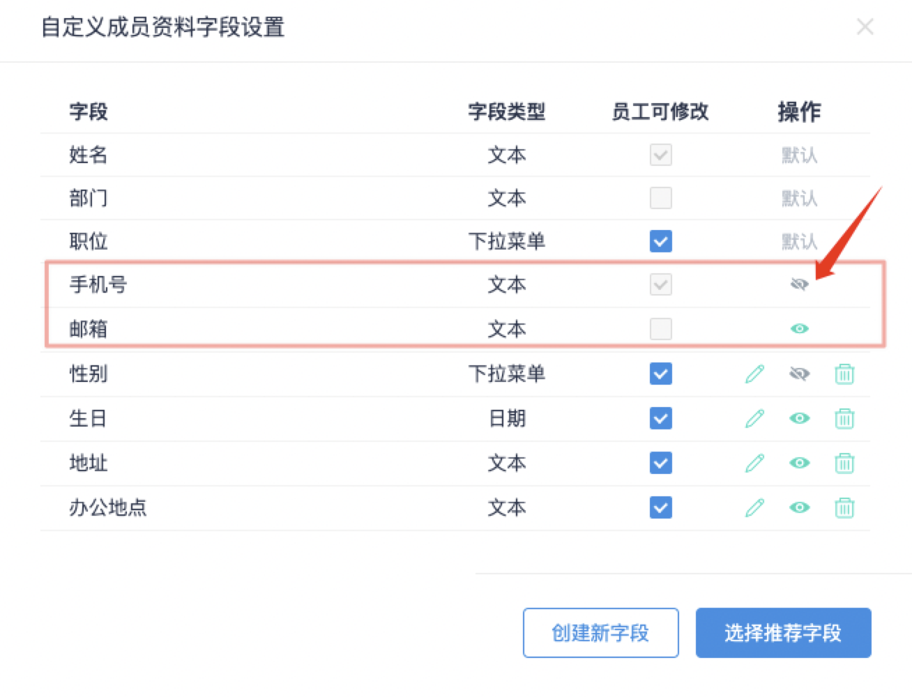 本次更新新增隐藏手机号和邮箱设置,加强隐私保护。在企业后台-成员管理-更多菜单-自定义成员资料字段设置中,对手机号和邮箱进行是否隐藏的设置: