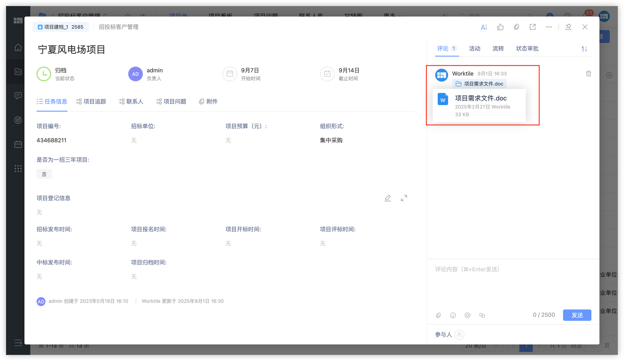 通过文件模块集中存储项目附件、投标资料,支持分类归档与快速检索,确保版本统一与访问便捷。