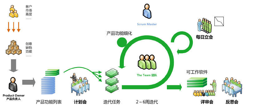 敏捷开发采用循序渐进的方法进行软件开发,把一个大项目分为多个相互联系,但也可独立运行的小项目,分别去完成,在此过程中软件一直处于可使用状态,敏捷开发的具体流程如下(以Scrum框架为例):