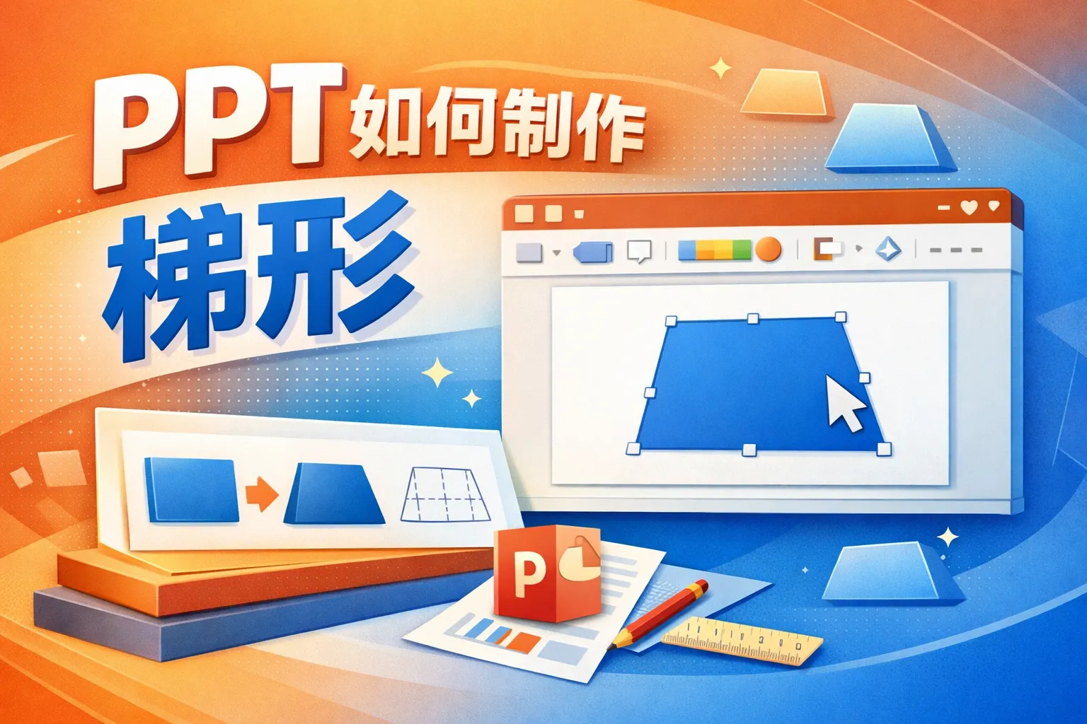 在PPT的菜单栏中选择“插入”->“形状”,从下拉菜单中找到梯形形状,点击后在幻灯片上拖动绘制即可。完成后,可以通过调整控制点来自定义梯形的大小和倾斜角度。