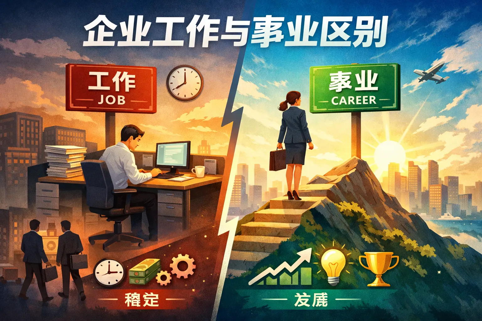 企业工作与事业的区别在于价值指向、时间维度和投入方式的不同。企业工作以岗位职责和绩效考核为核心,强调任务完成和稳定回报,更多体现为阶段性的雇佣关系;事业则围绕长期使命与价值创造展开,强调内在驱动、持续积累与社会影响。工作可以成为事业的起点,但只有当个人将职业活动与长期目标结合,并在组织中形成价值共创关系时,工作才会升级为事业。未来职场趋势显示,使命驱动与长期价值导向将成为职业发展的重要方向。