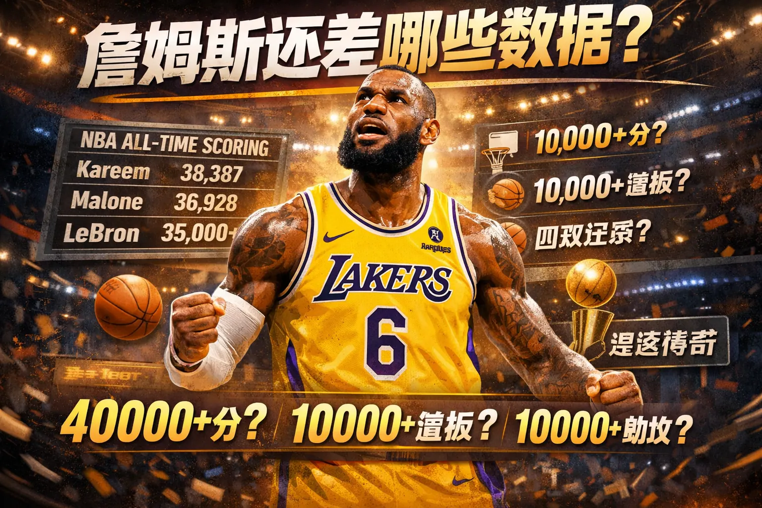 詹姆斯目前在总得分、全能数据和长期稳定性方面已创造历史级纪录,真正仍有差距的主要是总冠军数量、FMVP次数和部分防守荣誉。如果以历史第一人为标准,他理论上还差约2个总冠军及若干荣誉型指标;但在累计数据和跨时代竞争力方面,他已建立难以复制的优势。未来即便不再增加冠军,他的历史地位也将因超长巅峰周期而长期稳固。