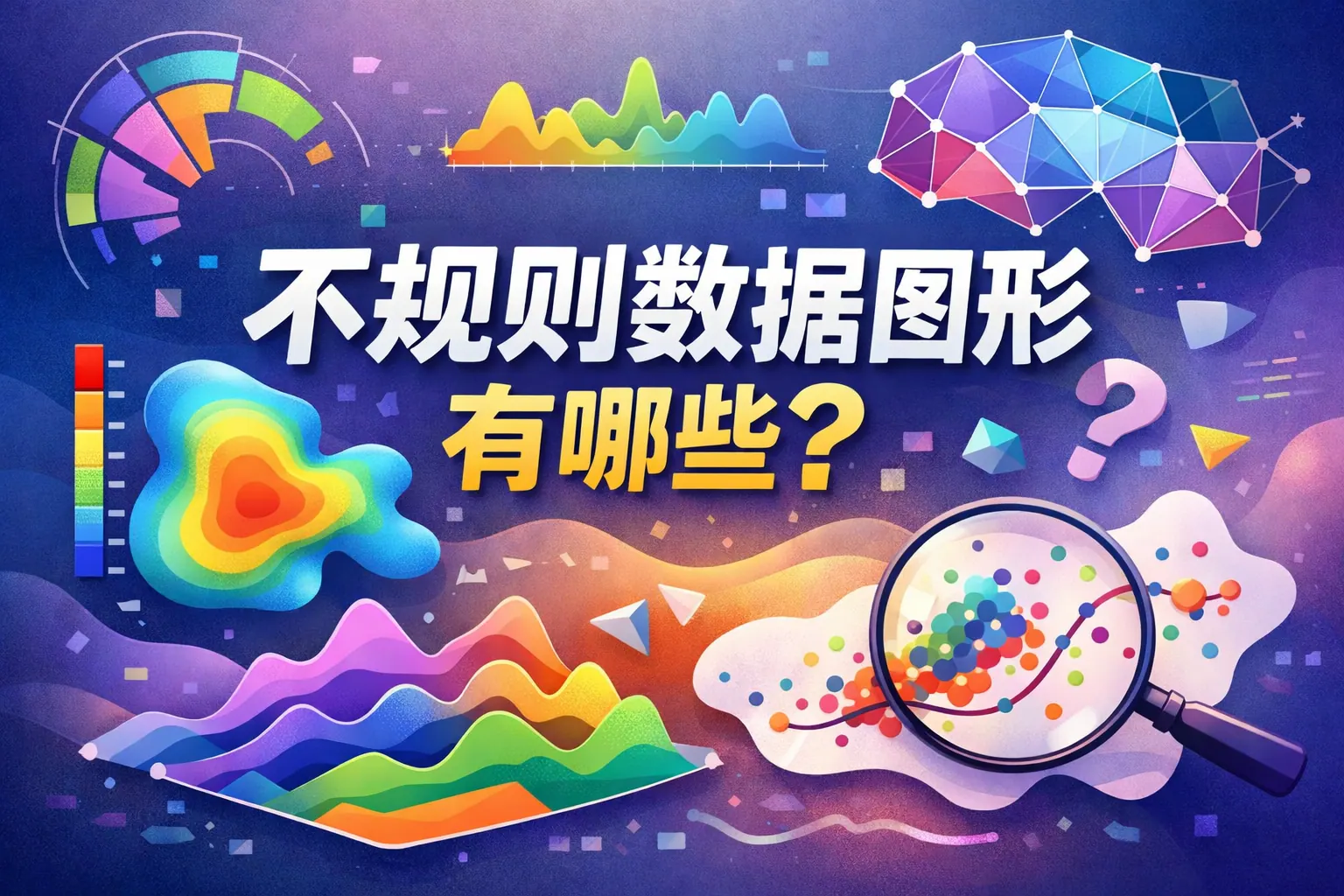 不规则数据图形是指结构不固定、形态随数据变化而变化的可视化形式,常见类型包括雷达图、热力图、网络图、桑基图、气泡图和等高线图等。这类图形适用于多维分析、空间分布、关系结构和动态变化场景,能够突破传统二维图表的限制,展示复杂关系与高维数据结构。在设计时需兼顾信息密度与可读性,并根据数据特征选择合适图形。未来,不规则数据图形将向智能化、交互化和动态化方向发展。