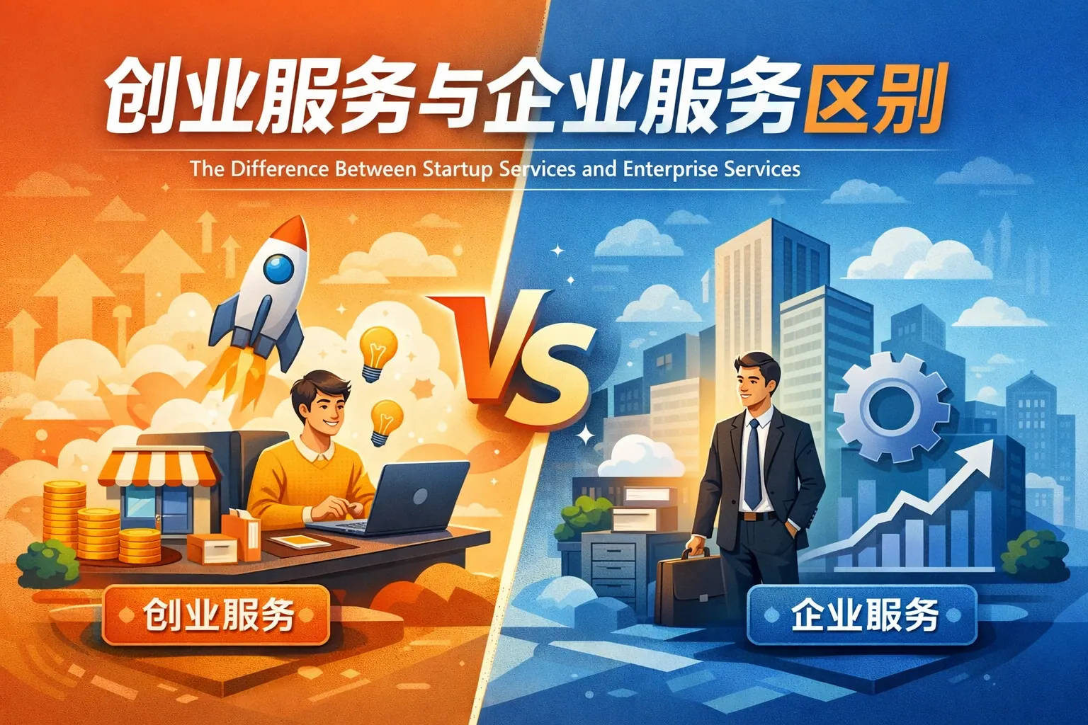 创业服务与企业服务的核心区别在于服务阶段与需求重点不同:创业服务面向初创团队,侧重公司设立、孵化辅导与资源对接,强调生态支持与政策属性;企业服务面向已运营企业,聚焦管理优化、专业外包与数字化建设,强调效率提升与市场化交付。前者解决“如何起步”,后者解决“如何发展”,两者在服务对象、商业模式与风险结构上均存在明显差异,但未来将呈现融合与专业化并行趋势。