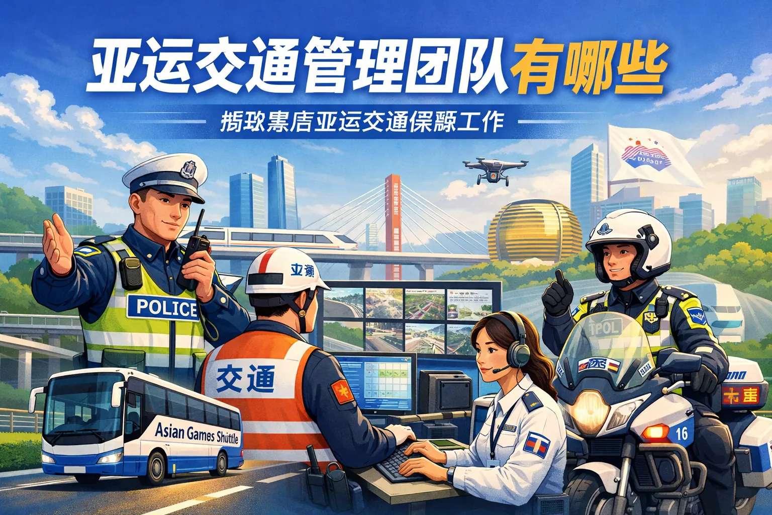 亚运交通管理团队由政府交通主管部门统筹,联合公安交警、公共交通运营单位、数字技术团队、志愿者组织及应急管理部门共同组成,形成覆盖规划、执法、运力保障、科技支撑与风险控制的综合体系。各团队分工明确又高度协同,通过智慧交通系统与多部门联动机制,实现赛事期间高效、安全、有序的交通运行,并推动城市治理能力提升与数字化转型。