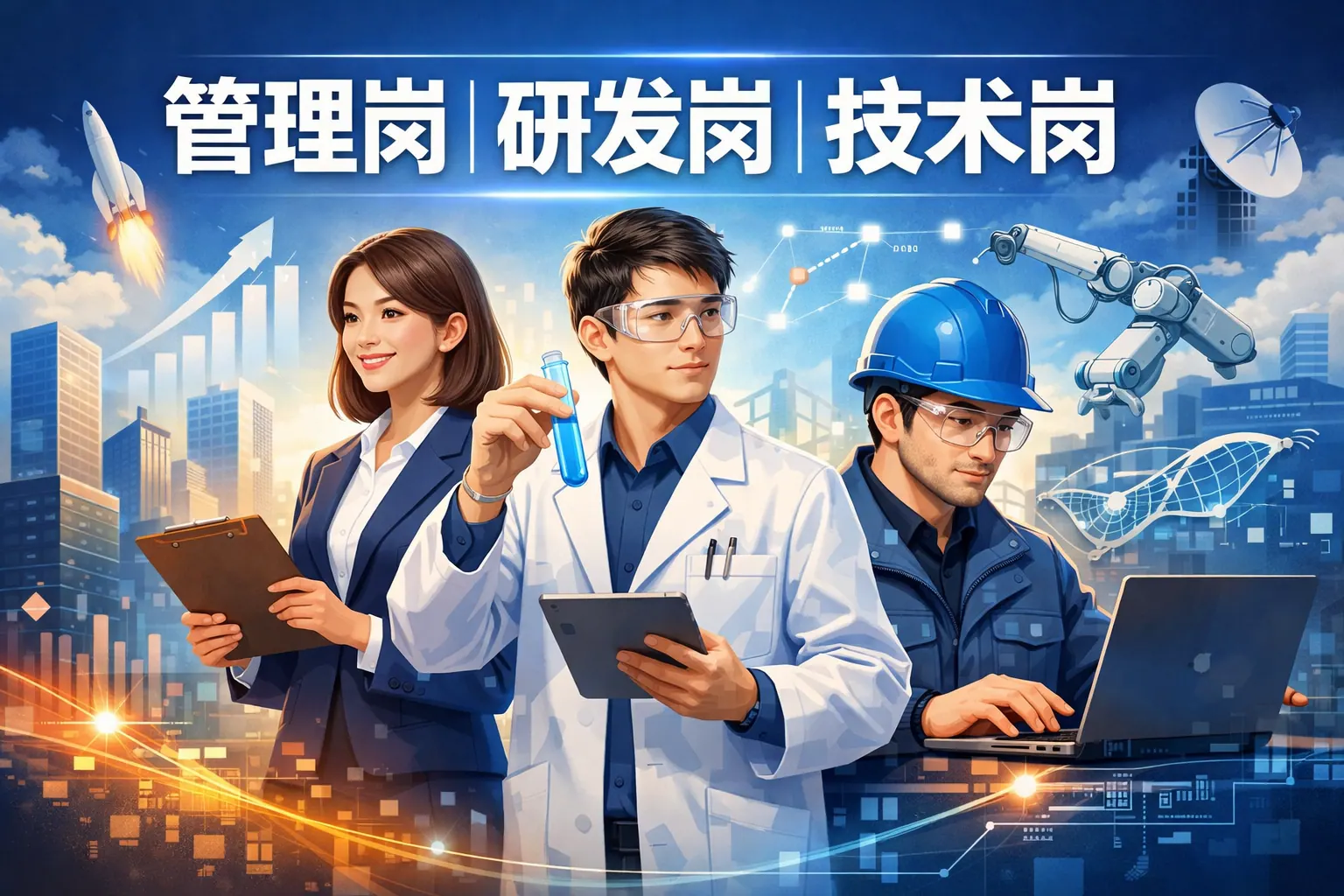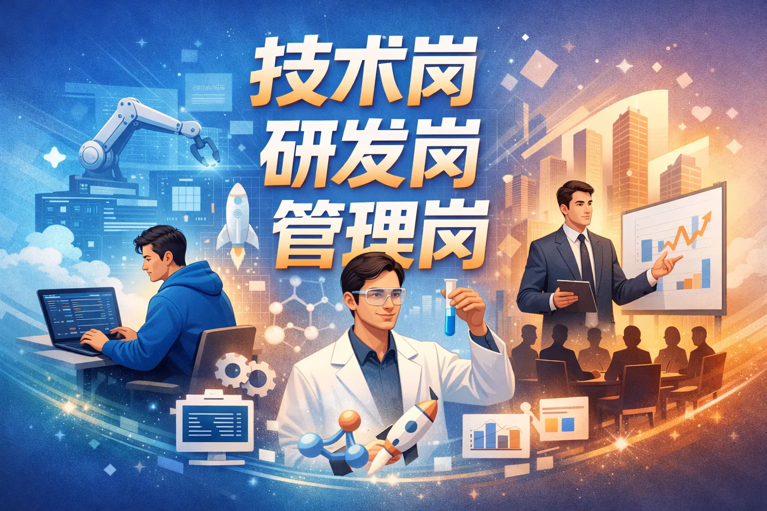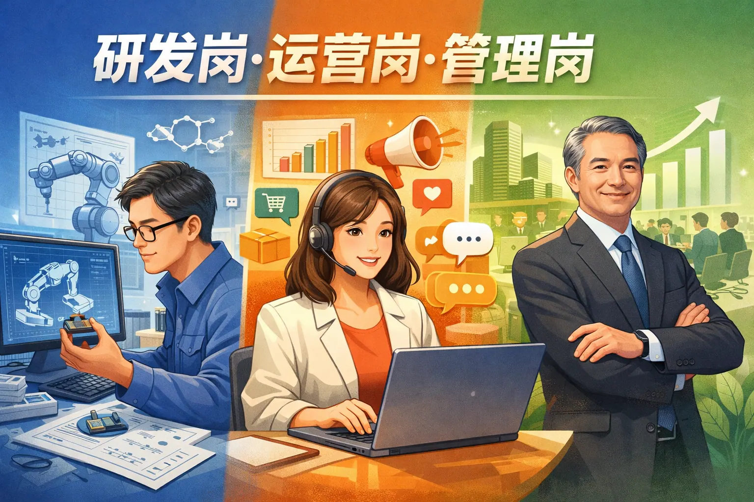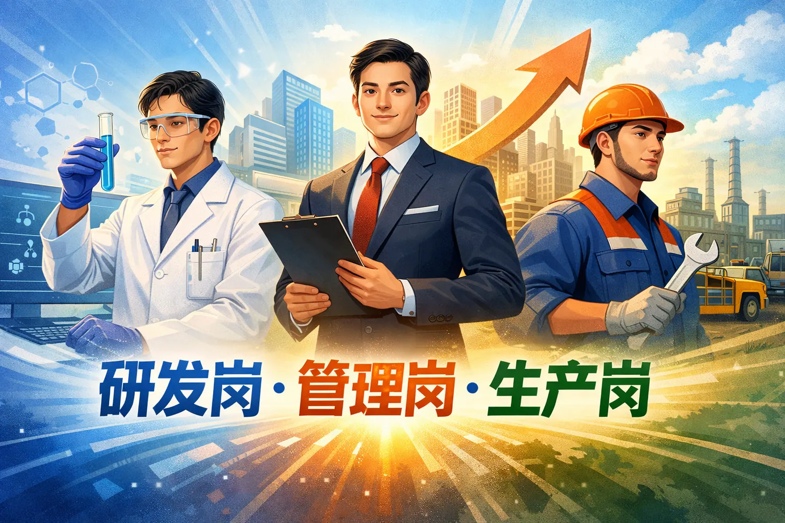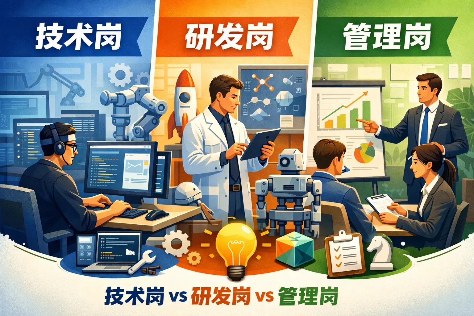 研发岗、管理岗与生产岗分别承担创新、协调与交付职责。研发岗位强调技术突破与问题解决,管理岗位聚焦资源整合与团队绩效,生产岗位关注效率与质量控制。三类岗位在能力结构、绩效评价与职业路径上存在明显差异,但本质上相互依存。未来组织更强调跨岗位协同与复合能力发展,个人应根据自身特质选择方向,并持续提升专业与综合能力,以适应数字化趋势下的岗位变化。