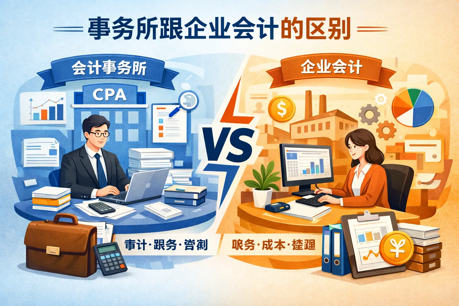 事务所会计与企业会计在职业定位、工作内容、能力要求、收入结构和发展路径上存在显著差异。事务所偏向外部审计与专业服务,强调项目制管理与专业判断,成长节奏快但工作强度高;企业会计侧重内部财务管理与经营支持,节奏稳定,更利于长期深耕业务与管理提升。选择哪条路径应结合个人性格、抗压能力与职业规划,未来两者都将向数字化与战略化方向升级。
