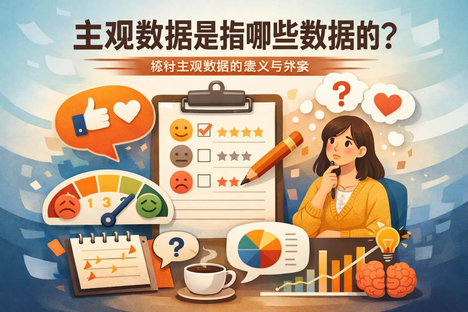 主观数据是基于个体认知、态度、情绪与判断形成的数据类型,包括满意度评分、专家预测、情绪反馈与行为意愿等。与客观数据不同,主观数据强调感知与心理评价,在企业管理、市场研究与组织决策中具有重要价值。尽管存在偏差与不稳定性,但通过科学设计与统计方法可以提升其可靠性。未来主观数据将与客观数据深度融合,成为数据驱动决策的重要组成部分。