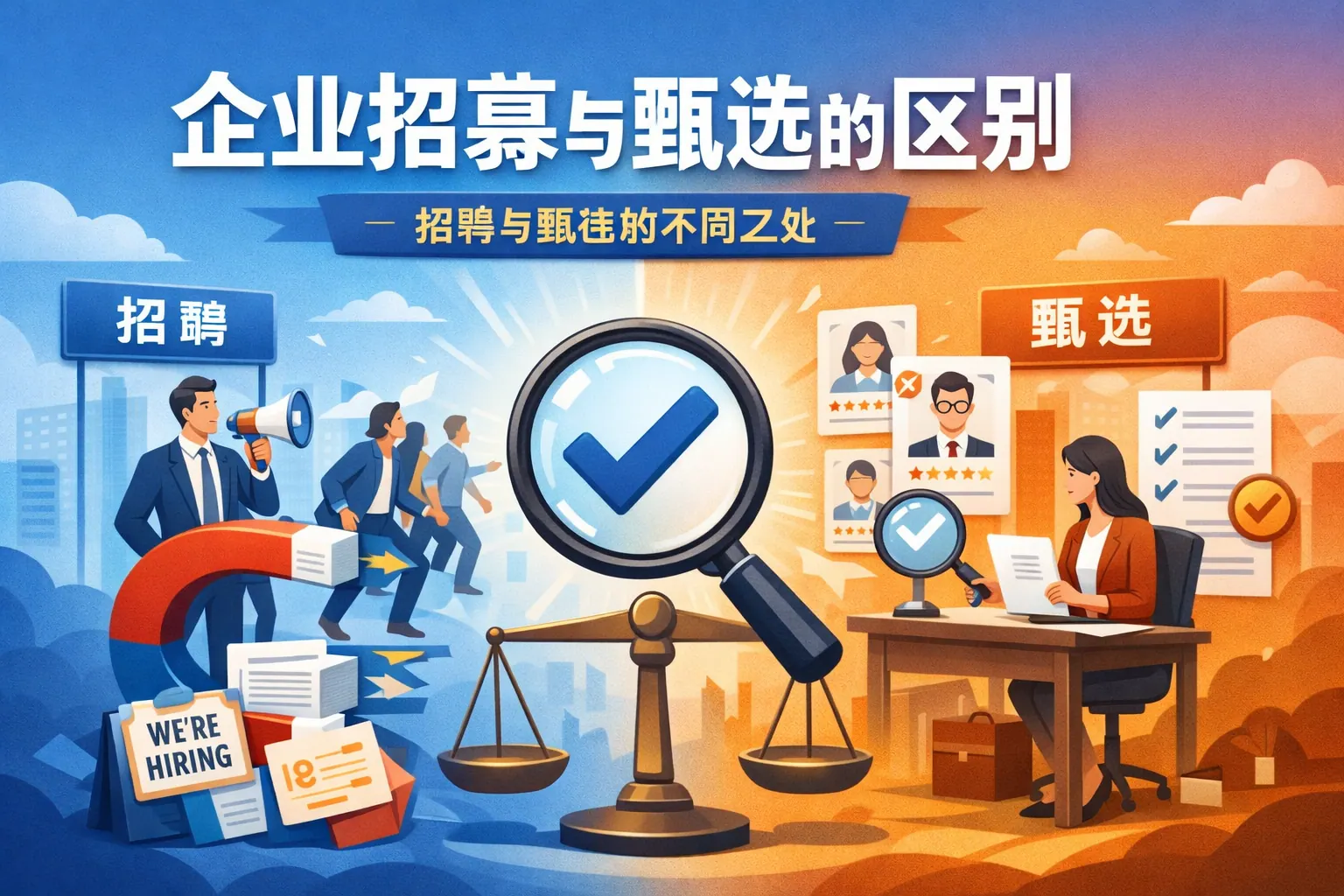 企业招募与甄选的核心区别在于前者侧重吸引人才、扩大候选人来源,后者侧重筛选评估、做出录用决策。两者在目标、流程、工具、成本结构和风险控制方面均存在明显差异。招募解决“有没有人”,甄选解决“选谁更合适”。在数字化趋势下,二者逐步融合,企业需要通过数据化与系统化管理,实现招募数量与甄选质量的平衡,以提升整体招聘效率与组织竞争力。