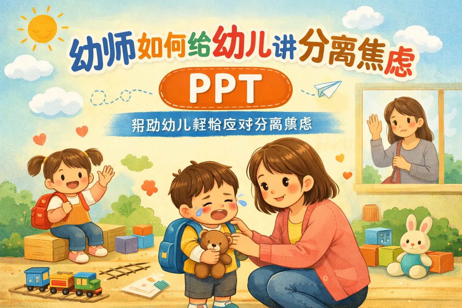 幼师在给幼儿讲解分离焦虑时,应以建立安全感为核心,通过故事化表达、游戏互动和家园共育方式,引导幼儿识别、表达与调节情绪。分离焦虑是幼儿正常发展阶段的一部分,关键在于尊重情绪、科学引导和分龄设计。通过结构清晰的PPT内容和体验式教学方法,幼儿能够逐步建立独立意识与心理韧性,为长期心理健康打下基础。