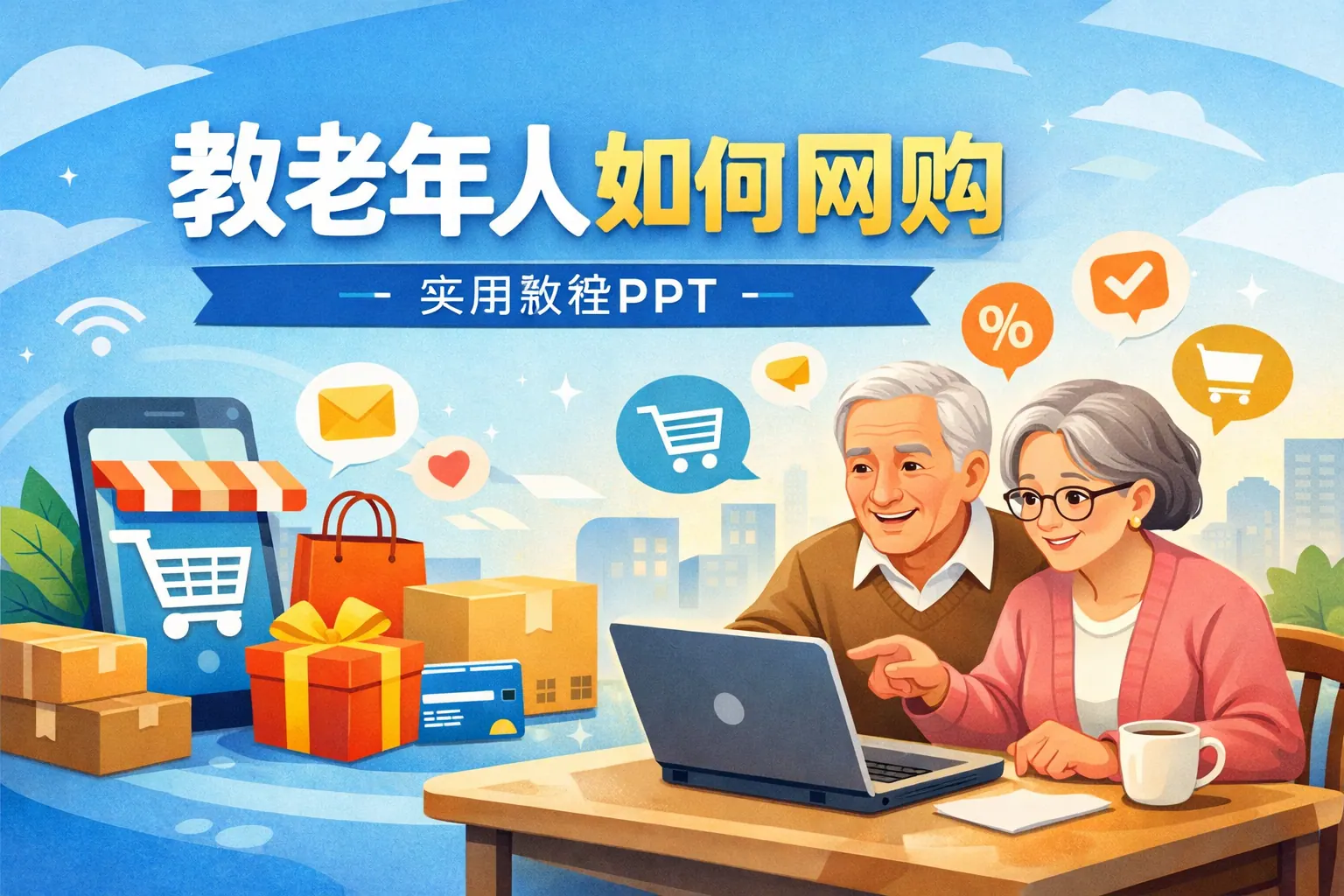 制作教老年人如何网购的PPT,应围绕安全、简单、可操作三个核心展开,采用分步骤演示方式讲解下载注册、搜索下单、支付方式、收货退货及防诈骗知识。课件设计需字体清晰、步骤明确,并结合真实平台界面讲解,强化不轻信、不透露、不转账的安全意识。通过系统化教学与实操演练,帮助老年人真正掌握网购流程,提升数字生活参与感与安全感。
