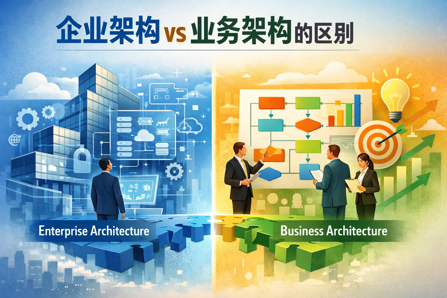 企业架构与业务架构的核心区别在于关注层级与职责范围不同:企业架构面向组织整体,统筹战略、数据、应用与技术,实现全局协同与治理;业务架构聚焦业务能力与价值创造,明确企业如何运作与如何达成战略目标。业务架构通常是企业架构的重要组成部分,为战略落地提供能力蓝图,而企业架构则提供技术与系统支撑。两者相互协同,是企业数字化转型与持续治理的重要基础。