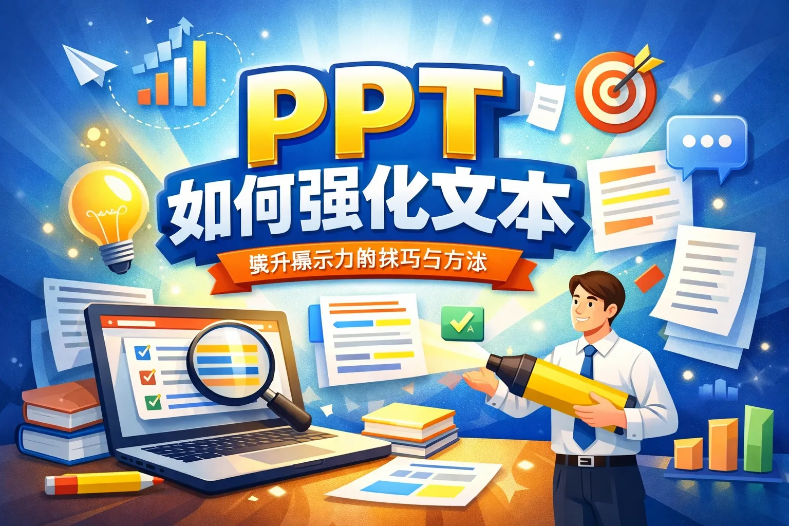 本文围绕PPT文本强化,从定位、视觉层级、表述方式、工具使用、误区规避和落地案例六个维度展开,提出用视觉层级锚定注意力和场景化表述强化记忆点的核心结论,结合权威报告数据和对比表格,讲解了具体的优化方法和适配策略,帮助职场人提升PPT文本传递效率和信息留存率。