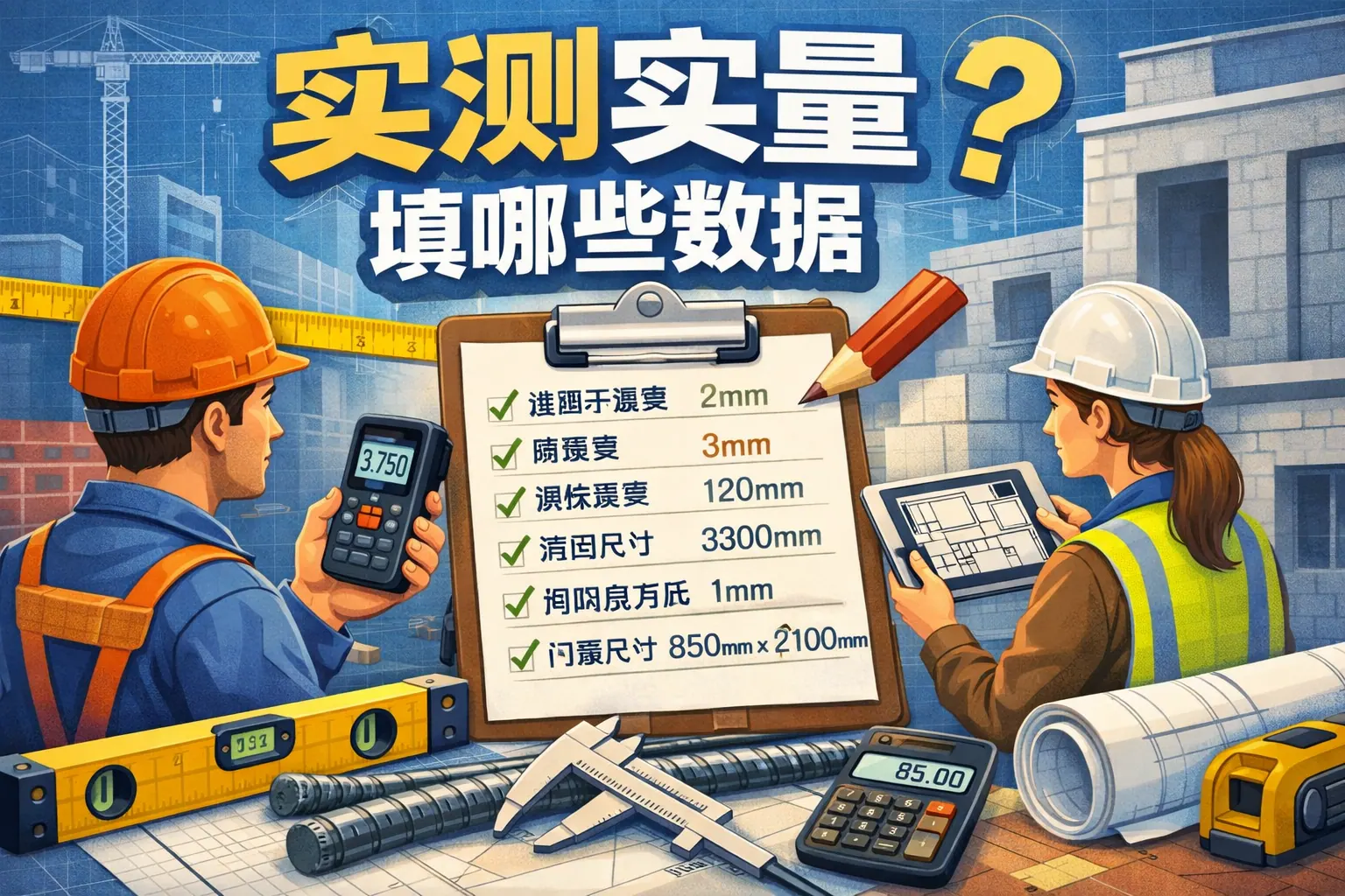 实测实量需要填写的数据主要包括尺寸偏差、标高与轴线数据、垂直度与平整度数据、强度与材料性能检测数据、抽检数量与合格率以及整改复检记录六大类内容。填写时必须包含设计值、实测值、允许偏差与判定结果,并确保数据真实、完整和可追溯。不同施工阶段关注重点不同,结构阶段侧重安全指标,装修阶段侧重观感质量。未来实测实量将向数字化、智能化方向发展,数据分析能力将成为工程质量管理的重要支撑。
