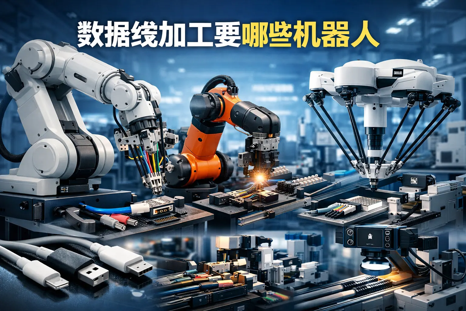 数据线加工通常需要六轴工业机器人、SCARA机器人、协作机器人、焊接与锁螺丝机器人以及视觉检测机器人等多种设备协同完成裁线、装配、焊接与检测等工序。不同规模企业应根据产量与产品结构选择匹配的自动化方案,大批量生产强调高速与稳定,小批量生产强调柔性与换型能力。未来趋势将向智能化与柔性自动化融合发展。