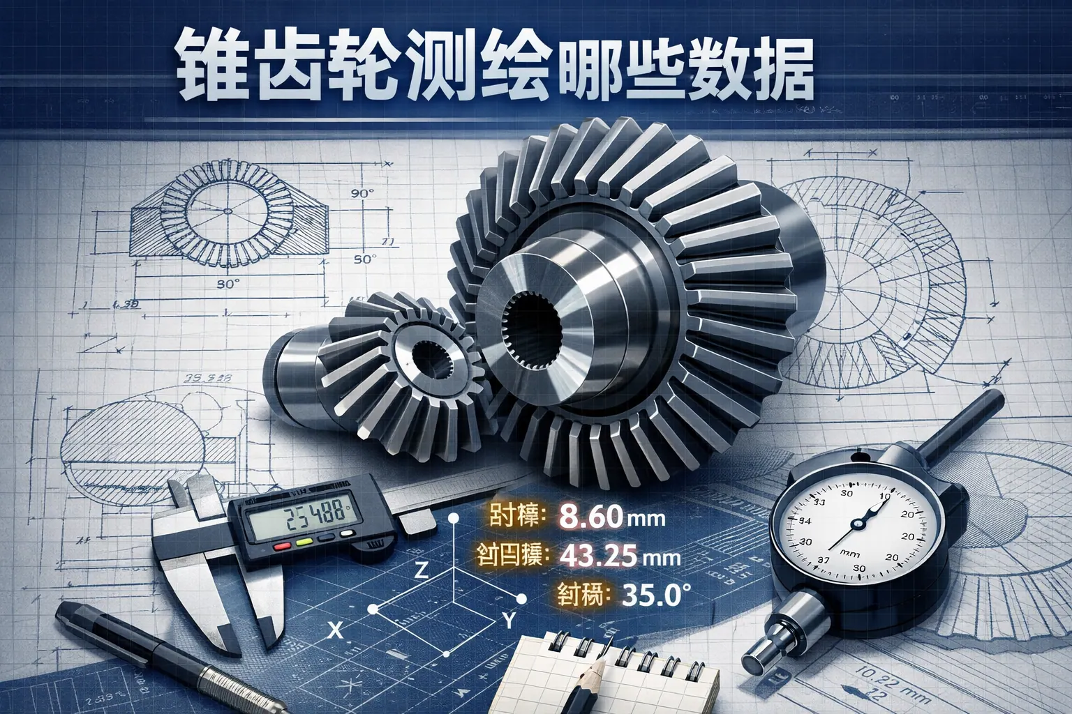 锥齿轮测绘需系统获取几何尺寸、齿形齿向、安装基准、精度误差以及材料热处理五大类核心数据,尤其要关注节锥角、模数、压力角和安装距等关键参数。完整的数据体系不仅用于尺寸复制,更关系到啮合性能与使用寿命。未来锥齿轮测绘将向数字化扫描与智能建模方向发展,实现更高精度与数据化管理。