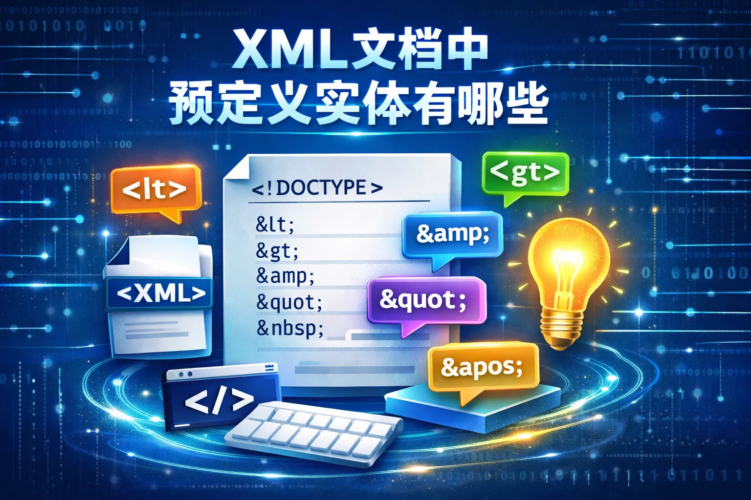 XML 预定义实体共有 5 个:<、>、&、"、',用于在元素文本与属性值中安全表示尖括号、与号与引号,防止与标签、实体和属性界定符冲突;文本中至少转义 & 和 <,属性值再转义与外层引号相同的引号;它们无需 DTD 声明即可直接使用,亦可用等价的字符引用(如 <)替代,建议结合验证与序列化工具统一规范与安全策略。