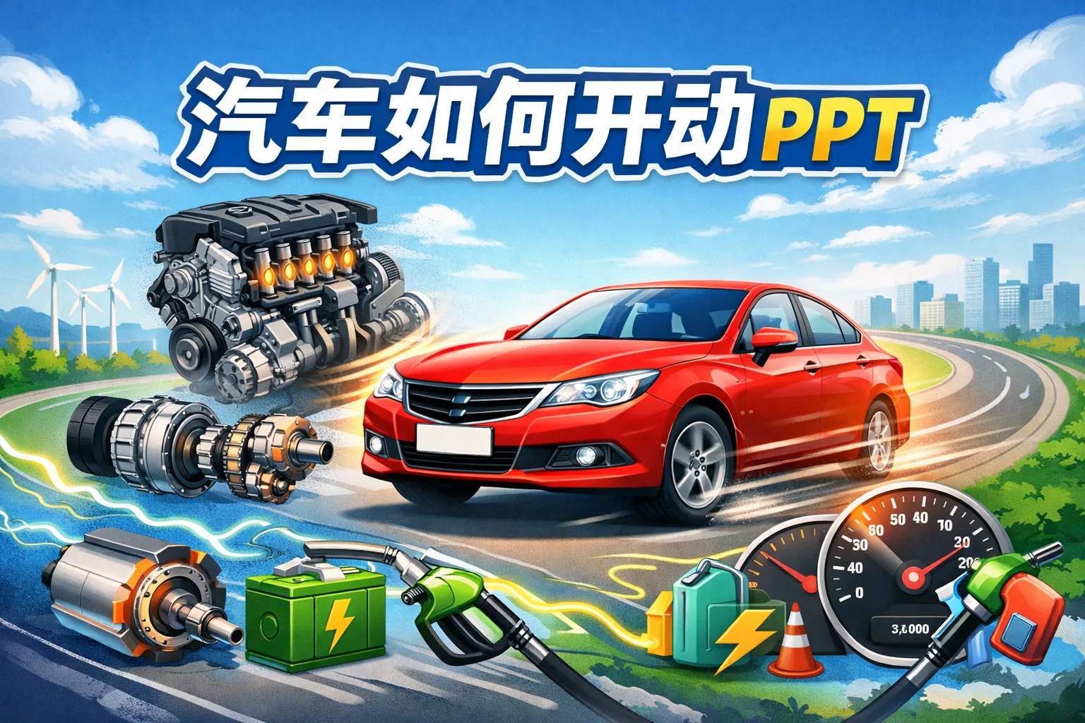 汽车开动的本质是将燃油或电能等能源转化为机械能,通过发动机或电机输出动力,经由变速箱、传动轴和差速器等系统传递至车轮,依靠轮胎与地面的摩擦力实现前进。制作汽车如何开动PPT时,应围绕能量转化、动力传递、控制系统与实际运动四个核心逻辑展开,并结合燃油车与电动车结构对比,使内容更清晰易懂。未来汽车将朝着电动化与智能化方向发展。