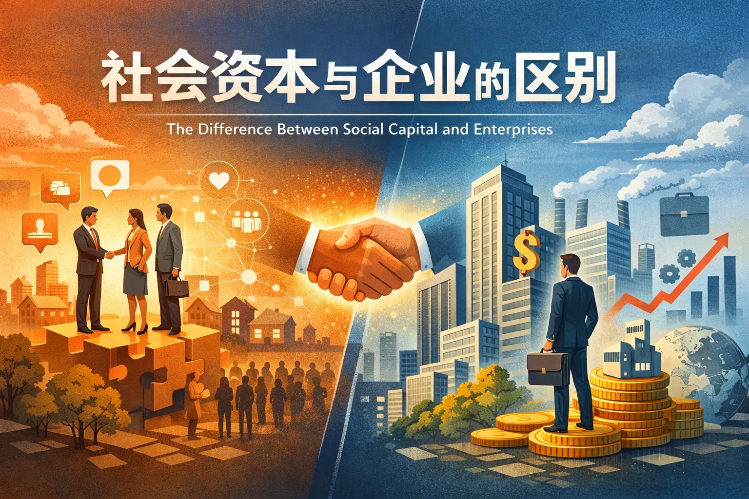 社会资本是一种嵌入于社会关系网络中的信任与规范资源,强调合作与协调效率;企业则是依法设立的组织实体,以资源整合和价值创造为核心目标。两者在性质、形成机制、治理方式与价值实现路径上存在本质差异,但在现实经济活动中高度互动。社会资本为企业发展提供信任基础与关系网络,企业则通过制度化运作放大社会资本的经济价值。理解二者区别,有助于优化企业战略与社会治理结构。