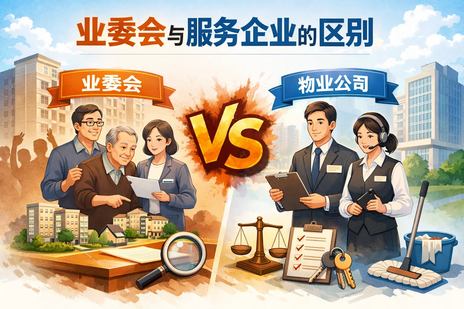 业委会与服务企业的核心区别在于法律性质和权力来源不同:业委会是由业主选举产生的自治组织,代表全体业主行使决策与监督权;服务企业是市场化经营主体,通过合同提供物业服务并获取报酬。二者在组织目标、资金归属、责任承担和合同关系上存在明显差异。明确这种分工,有助于厘清社区治理结构,减少纠纷,实现业主自治与专业服务的协同发展。