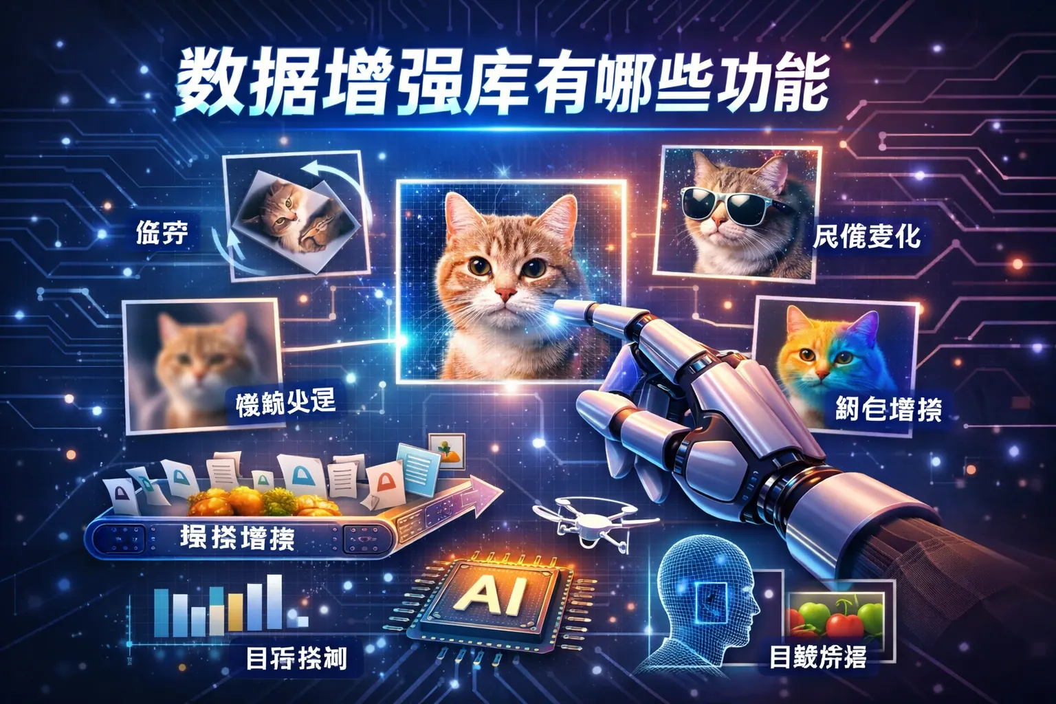 数据增强库的核心功能是通过对图像、文本、语音等数据进行可控变换与扩展,提升模型的泛化能力与鲁棒性。其主要功能包括几何变换、颜色与噪声处理、文本语义替换、语音频域扰动、自动策略搜索、混合样本生成以及高性能数据管道支持。随着自动化与生成式技术的发展,数据增强正从规则变换走向智能优化,成为提升模型性能和应对复杂场景的重要手段。