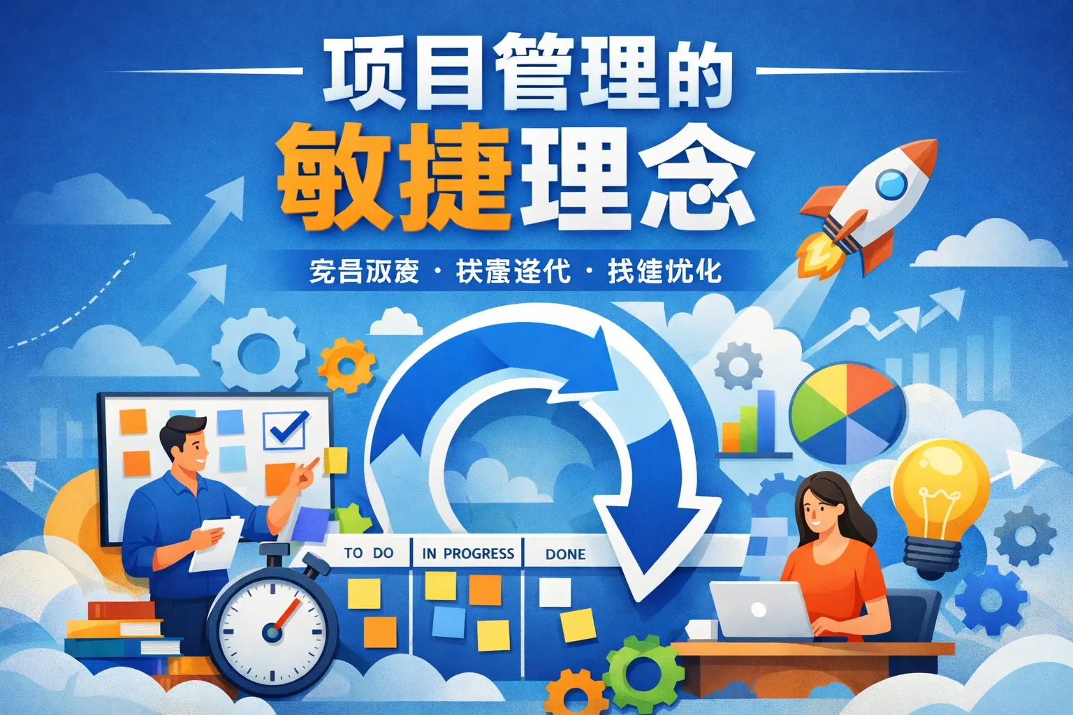 项目管理的敏捷理念是一种以快速响应变化、持续交付价值和团队自组织协作为核心的方法体系。它强调迭代式开发、客户持续参与和动态规划,相比传统项目管理更具灵活性和适应性。敏捷通过小步快跑和持续反馈降低风险,提高客户满意度和团队效率,但也对组织文化和团队成熟度提出更高要求。未来,敏捷将向规模化与数字化方向发展,并在更多行业实现融合应用。