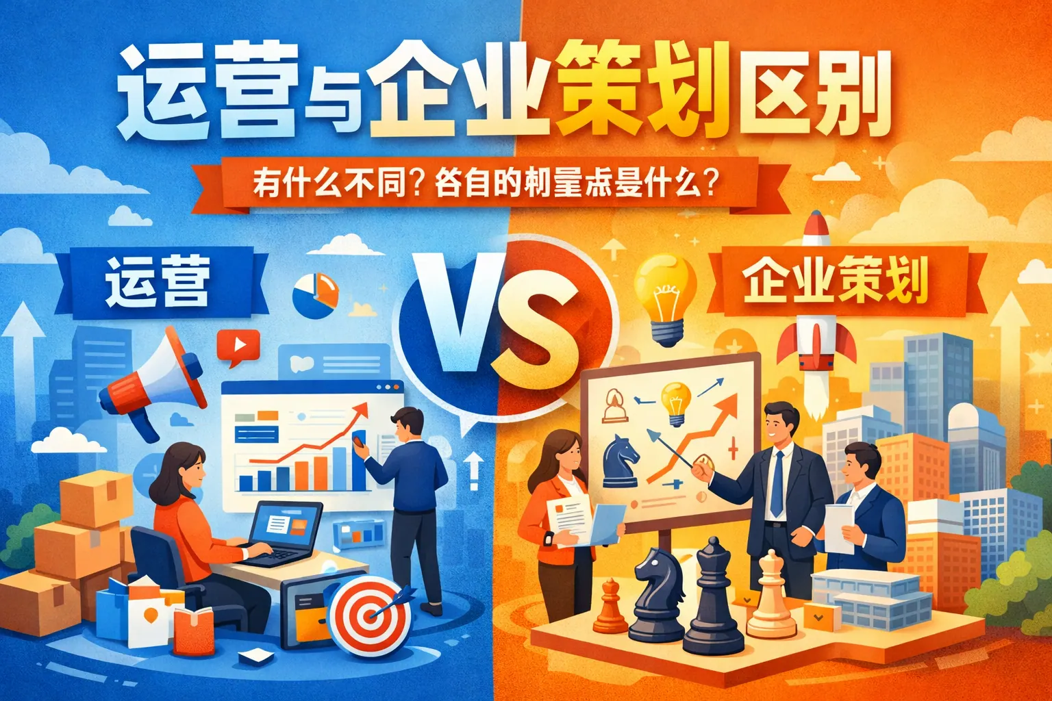 运营与企业策划的核心区别在于职能定位与时间维度:运营强调日常执行与效率优化,以数据和结果为导向;企业策划侧重战略规划与阶段性方案制定,关注方向与整体布局。两者在能力结构、成果评估方式与组织角色上均存在差异,但本质上相互协同,共同推动企业战略落地与持续增长。未来趋势将走向战略与执行融合,但专业分工依然重要。