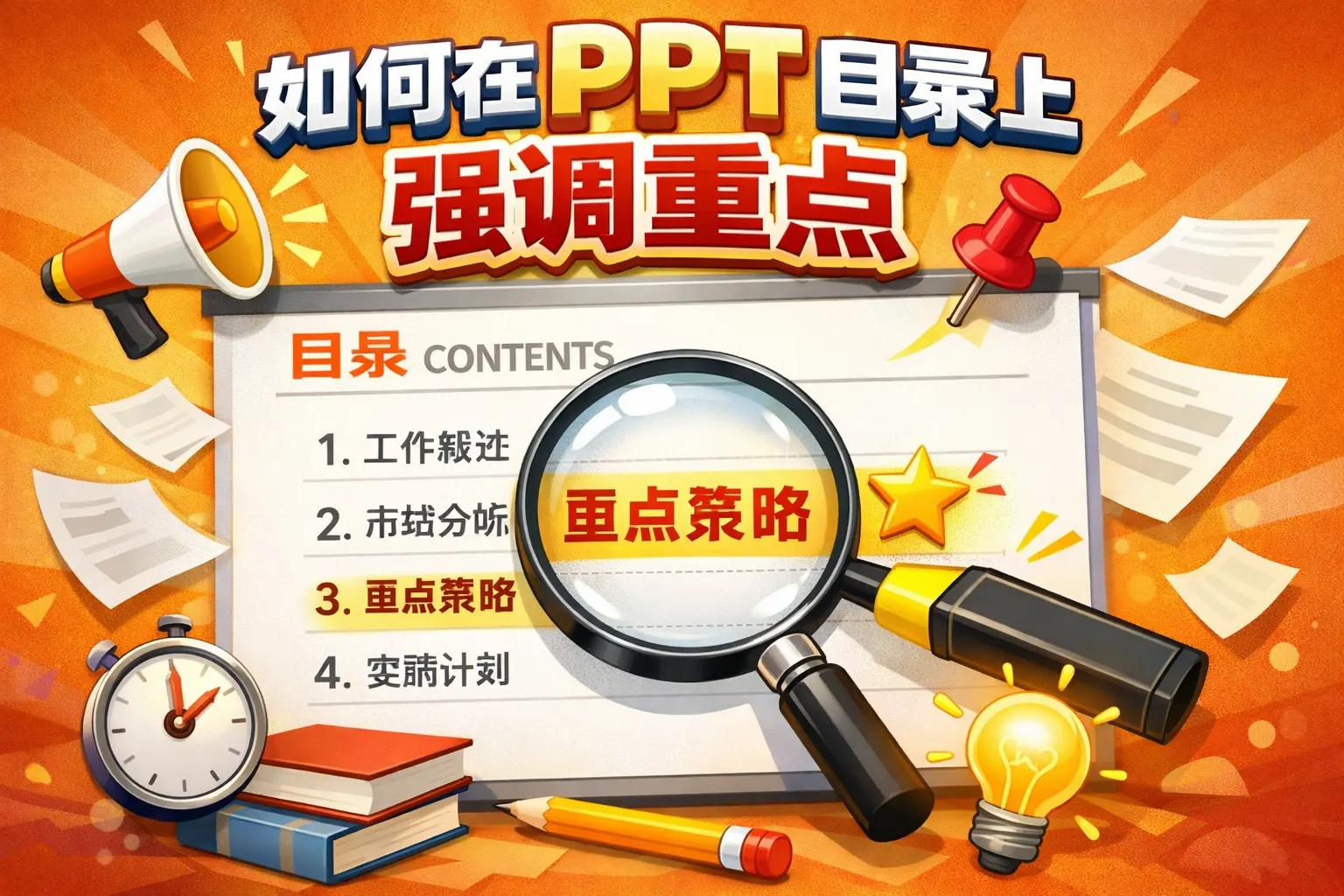 在PPT目录页强调重点的关键在于通过结构重排、视觉层级和叙事语言三方面协同设计,让核心模块在逻辑与视觉上同时突出。通过字号差异、色彩对比、空间比例扩大及副标题说明等方式,可以自然形成主线表达,避免信息平均分配带来的注意力分散。强调应控制在1-2个核心模块,结合具体场景选择策略,并避免过度装饰与视觉混乱。未来目录设计将更趋向互动化与动态化,强调结构清晰与战略表达能力。