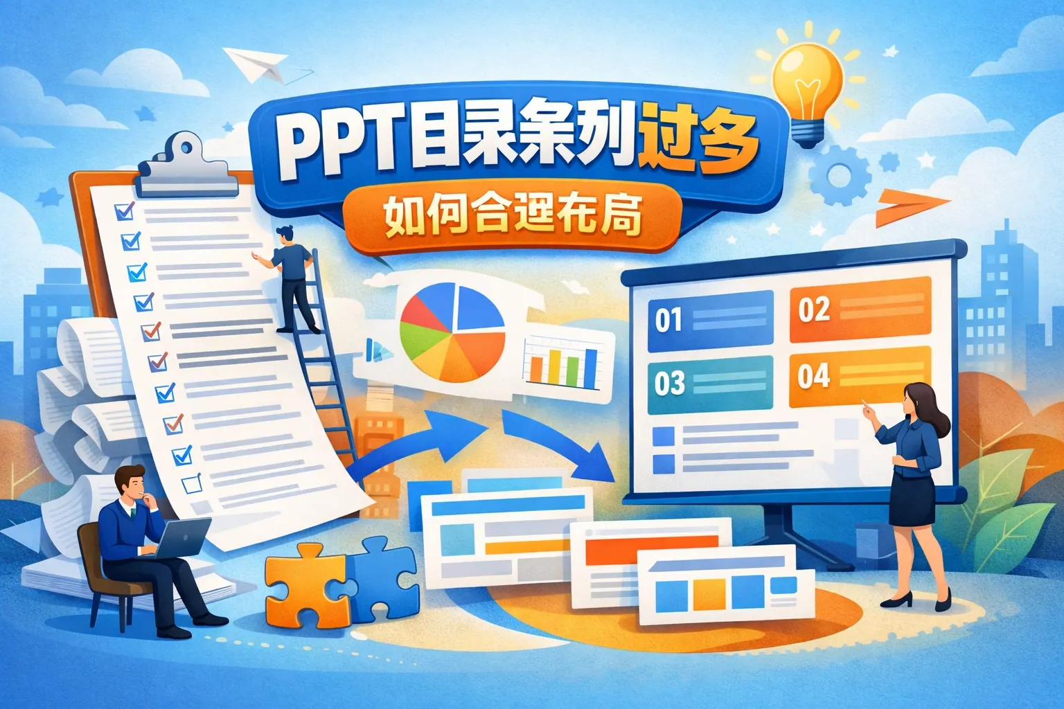 PPT目录条列过多会增加认知负担,影响结构清晰度。优化关键在于结构重组、层级控制与视觉减负,通过合并主题、限制一级目录数量、分页展示、采用视觉导航和渐进式目录等方式,可以在不删减核心内容的前提下提升逻辑性与专业感。不同场景应匹配不同目录布局策略,未来目录设计将更强调信息架构与视觉表达的融合。