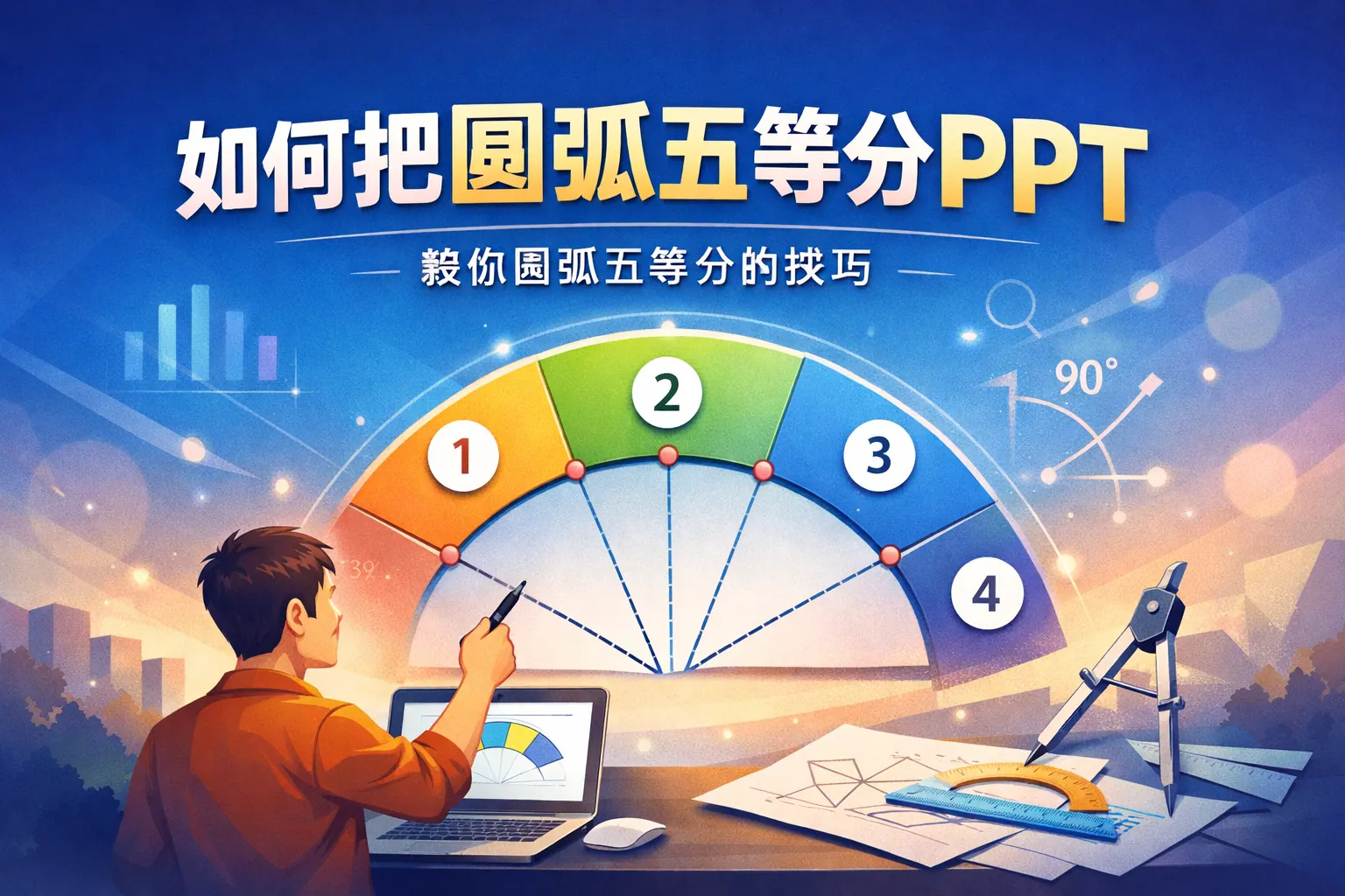 本文系统讲解了在 PowerPoint 中实现圆弧五等分的核心思路与具体方法。通过几何角度原理,将整圆 360° 转化为每份 72°,并结合扇形工具、圆形拆分以及旋转复制三种实用方式,即可在不借助插件的情况下完成精准分割。文章还对不同方法的适用场景进行了对比分析,指出旋转复制在效率与一致性上的优势,同时总结了常见操作误区与修正技巧,为商业汇报、教学演示和结构化表达提供了可复用的解决方案。