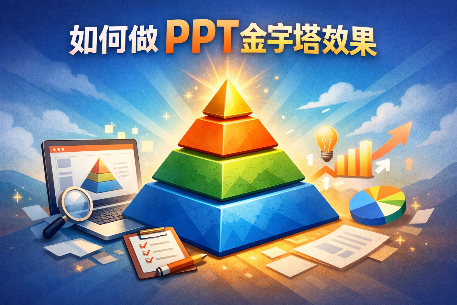 制作PPT金字塔效果的关键在于结构清晰、层级递进和视觉聚焦。通过SmartArt快速生成或使用形状自定义绘制,可以实现不同层级的金字塔图示。设计时应遵循结论先行、逻辑递进、层次分明的原则,控制层级数量与文字长度,利用渐变与对齐优化视觉效果。不同应用场景需匹配相应结构与风格。未来趋势将结合智能化设计与结构化表达能力,使金字塔效果更加高效和专业。