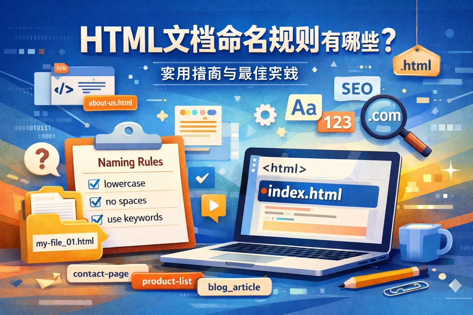 HTML文档命名规则应坚持小写与短横线分词、语义清晰与长度适中、避免空格与特殊字符、目录层级浅而规范,并为首页采用index.html;重命名需配301与sitemap更新,多语言以目录区分并统一slug策略。通过工程化校验与团队规范,将命名规则固化为流程与工具,长期提升SEO、跨平台兼容与内容治理质量。