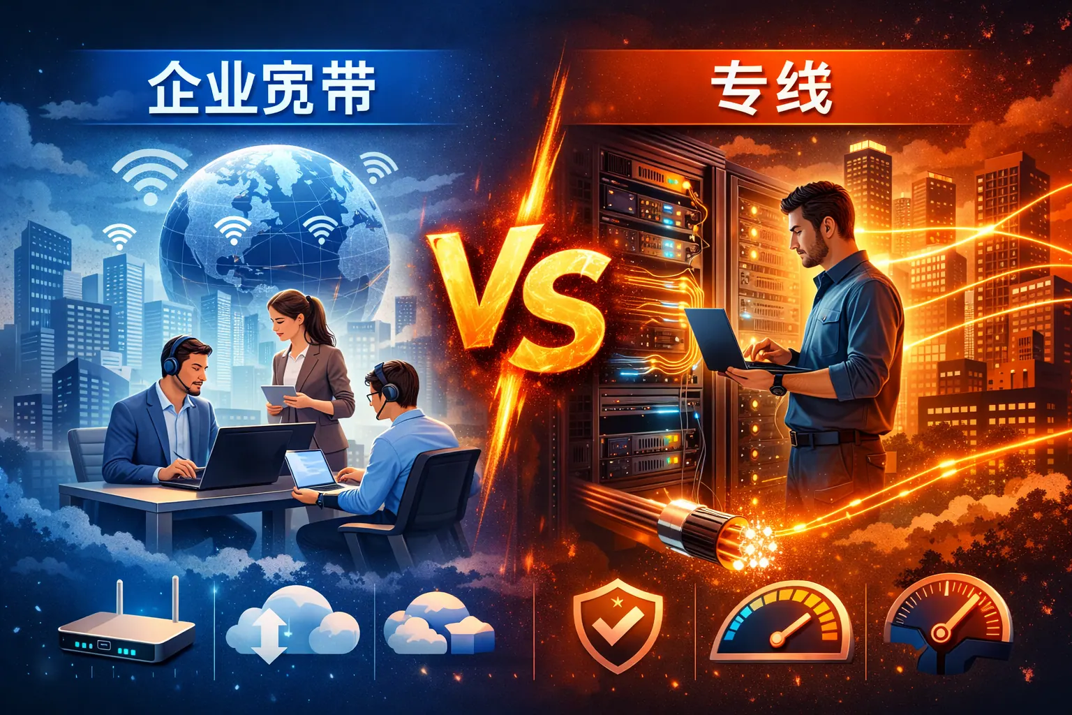 企业专线与企业宽带的核心区别在于带宽是否独享、是否对称、是否提供SLA保障以及网络稳定性与安全性的差异。企业专线采用独享对称带宽并提供服务等级协议,适合对稳定性和数据安全要求高的关键业务;企业宽带为共享资源,成本较低,更适合日常办公场景。企业在选择时应综合考虑业务连续性、预算投入与未来扩展需求,合理规划网络架构。