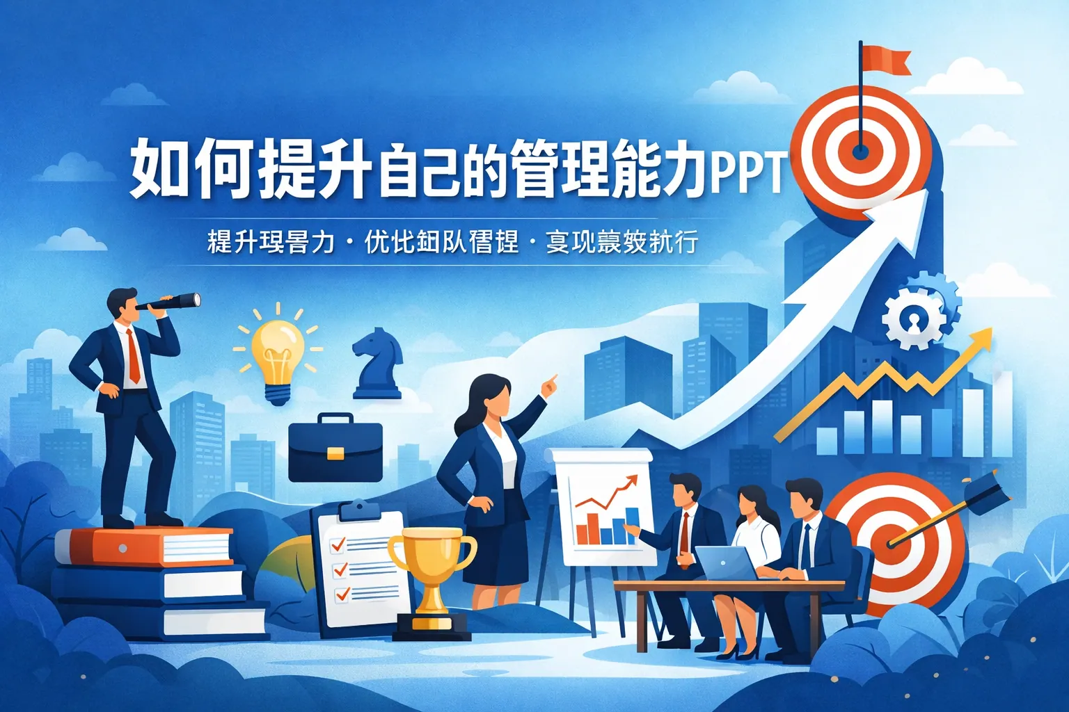 提升管理能力的关键在于认知升级、目标管理优化、沟通协作强化与执行力建设的系统提升。一份高质量的管理能力提升PPT应围绕自我认知、目标拆解、团队激励、决策控制与持续学习等核心模块展开,通过模型工具与案例分析构建可落地的行动路径。未来管理趋势更加重视赋能型领导与数据化决策,持续学习与复盘将成为管理者能力成长的重要驱动力。