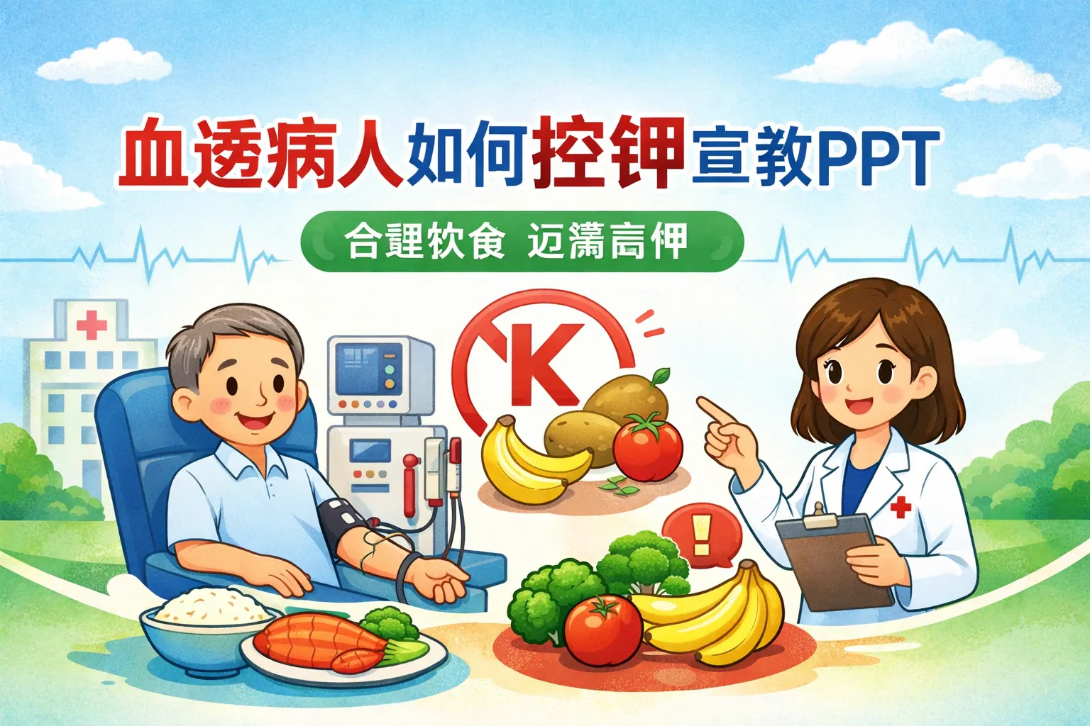 本文系统讲解了血液透析患者为什么必须严格控钾,以及血钾升高的常见原因、饮食来源与风险行为,并给出了适合宣教PPT直接使用的结构化内容。文章通过明确每日钾摄入目标、高钾与低钾食物对比、烹饪降钾方法和应急识别要点,帮助患者将控钾从“知道”转化为“做到”。整体强调控钾是长期生活管理而非短期限制,对降低高钾并发症风险具有关键意义。